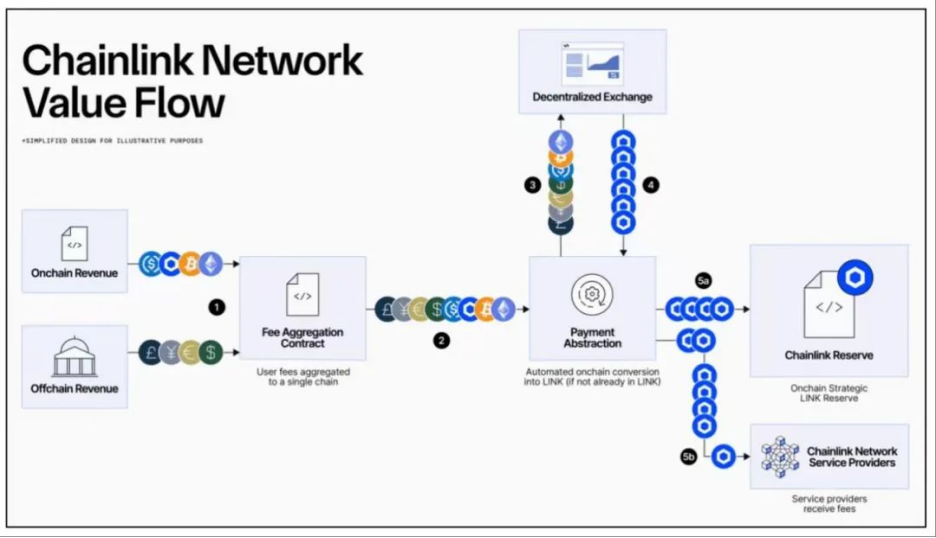 Chainlink以“B2D/B2B2C”的按需服务费为主(价格/数据服务费、CCIP跨链费、PoR审核/监控费、Data Streams订阅费等),费用通过网络路由至节点与安全预算,并在Economics 2.0框架内与Staking/抵押、警报/惩罚(slashing)联动,以实现“更高经济安全→更高付费意愿→更高服务费→更强安全预算”的正循环。Staking v0.2将池上限扩至4500万LINK(社区约4,087.5万,节点运维方其余),引入可解绑机制(28天冷却+7天领取窗口)以兼顾安全与灵活;节点抵押部分设定基准奖励率并可叠加“委托奖励”,未来随用户费分配的权重增加,Staking的“现金流属性”有望更强。媒体与研究稿件在2025年多次提到“LINK reserve”(链上储备、以企业/服务费等来源定期购入LINK的机制)这一新元素,目的是改善交易所浮动流动性与供给弹性,但需强调——该机制目前以媒体与行业分析描述为主,官方尚未发布系统性白皮书式论证,因而我们在估值假设中将其作为“情景可选参数”,而非基准事实。