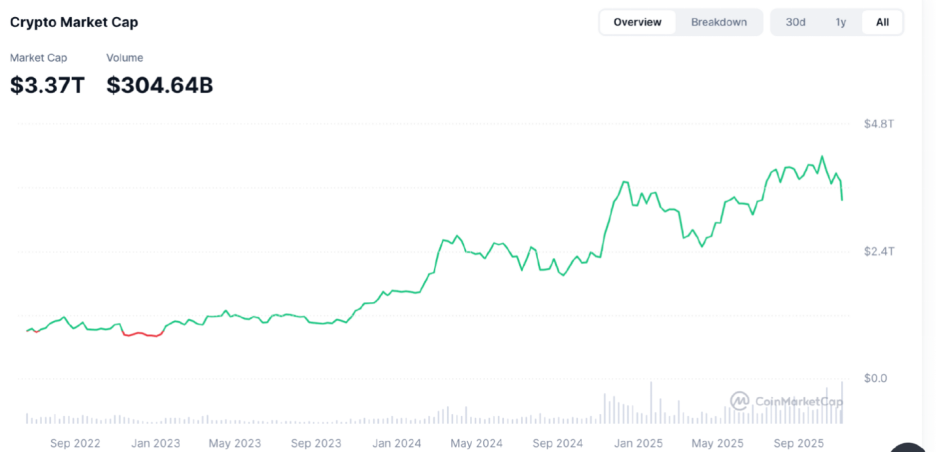 2025年11月,全球加密市场处在一个结构性转折点:不是新牛的全面起势,也非下行深渊的被动防守,而是“脱虚向实、从叙事回归技术、从纯投机转向结构性参与”的关键窗口。推动这一转折的根因,不在单一价格或单一政策,而在宏观范式的整体切换,过去两年,后疫情时代以财政支出扩表为主导的总需求管理逐步退潮,货币政策的中性偏紧周期显著见顶,政府对流动性的直接牵引力减弱,私人部门重新拿回资本分配的主导权,新科技叙事和生产函数的重估开始影响资产定价的底层逻辑。政策的重心,从“补贴与转移支付拉动名义需求”转向“效率与技术进步带动潜在增速”。在这个过渡中,市场愿意为“具可验证现金流与技术扩张曲线”的资产支付溢价,而对“高杠杆、强顺周期、单靠估值扩张”的标的显得更为审慎。