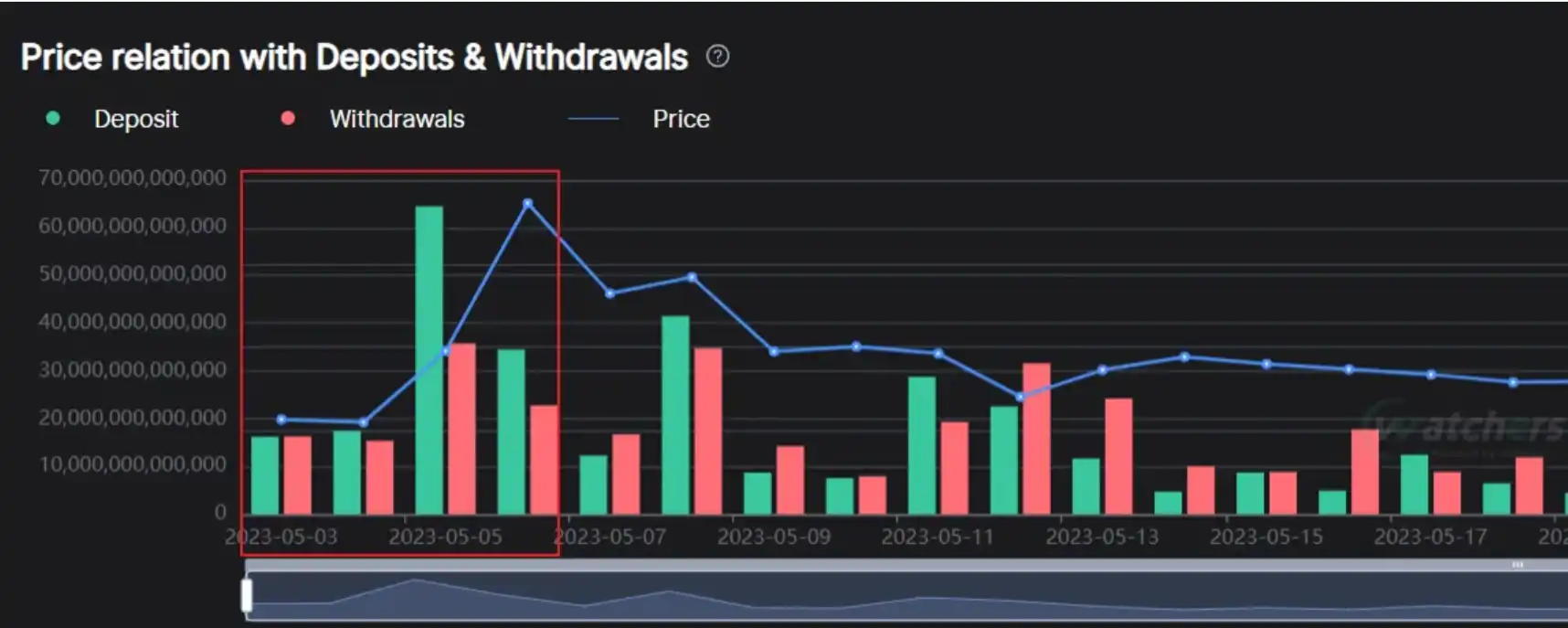 上面是 watechers 的交易所流入流出情况,绿色代表流入,绿色柱子高于红色,代表净流入