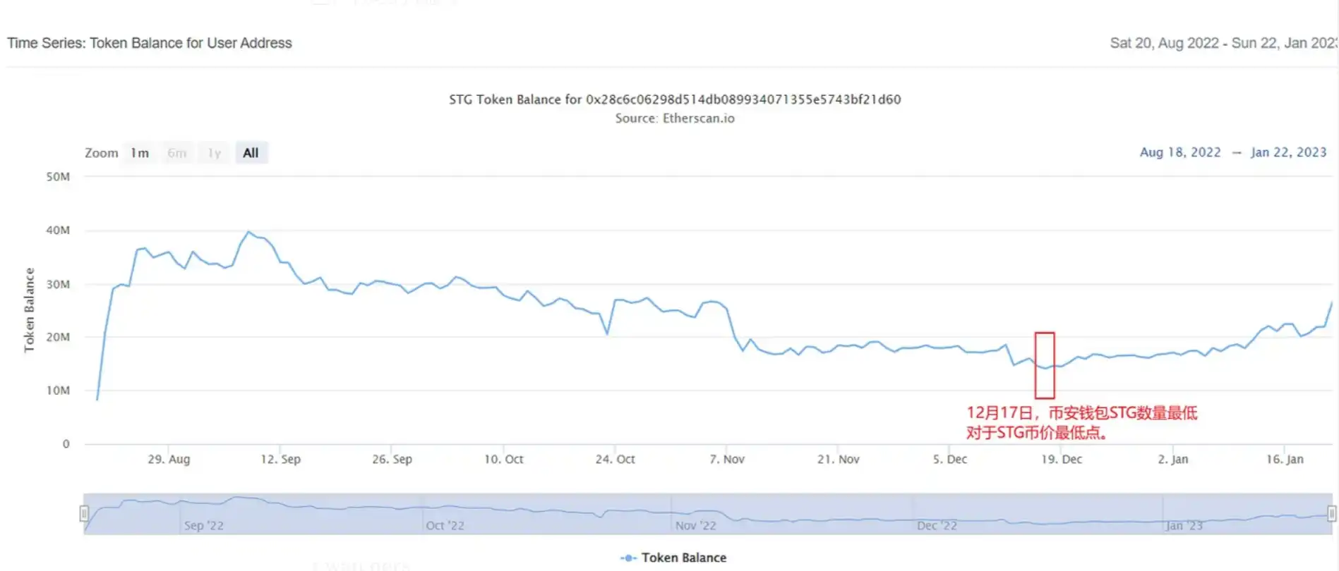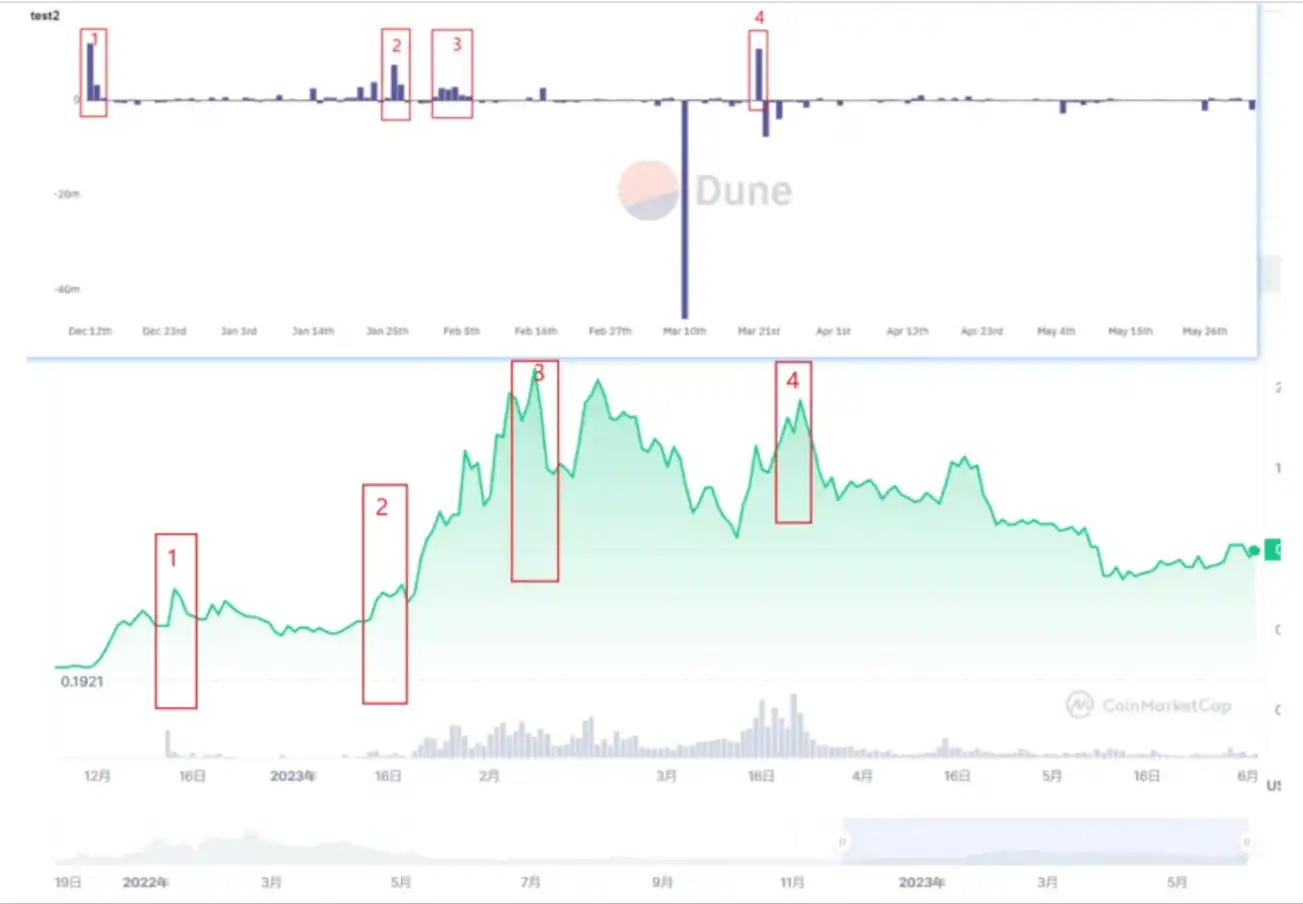 对币安 14 的代币余额发现,在一路下跌中,交易所的 STG 余额是在一路下跌的,说明在 STG 的下跌中,有资金在不断的买入。直到 12 月 17 日,币安钱包内 STG 达到最低,同期 STG 的币价也是局部最低的,并且经过几天调整后,开始了上涨。