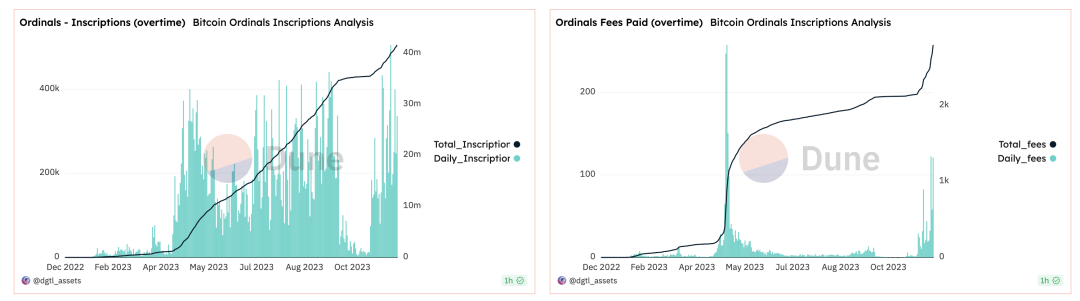 23 年初,Casey 在比特币主网上推出了 NFT 协议 Ordinals。该协议允许识别和跟踪每个聪,并提供链上资产验证。自推出以来,Ordinals 彻底改变了比特币 NFT 的局面,交易量大幅增长,新的 Ordinal NFT 市场不断涌现。截止 11 月 19 日,Ordinals 铭文铸造超过 4100 万,铸造费用接近一亿美金。