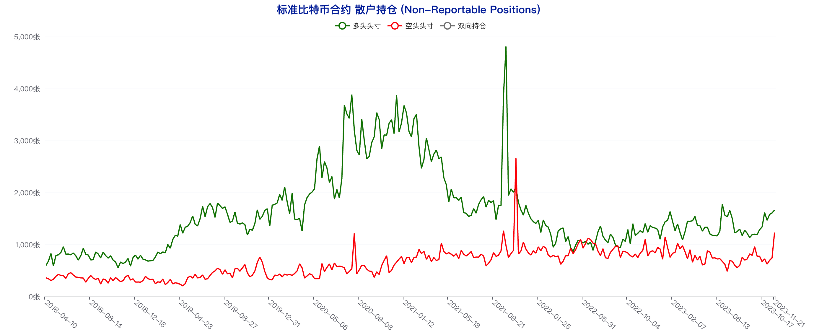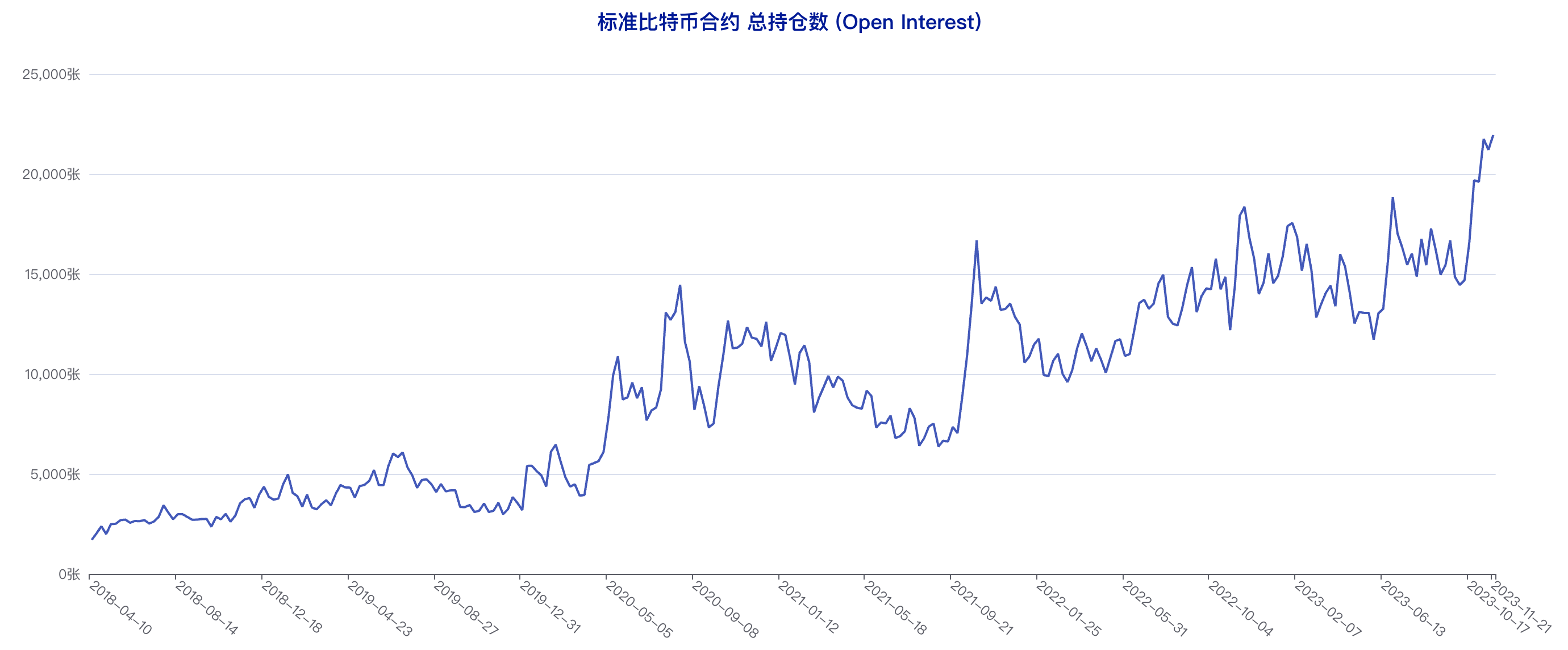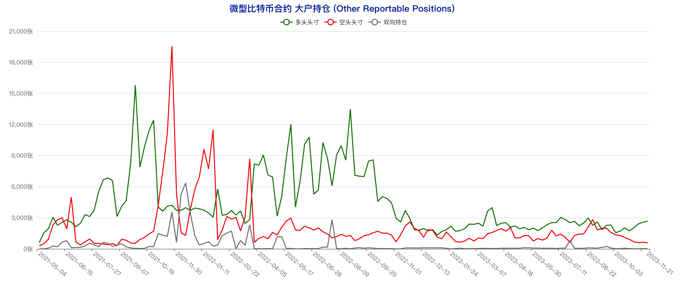 受假期影响,最新一期 CFTC 持仓周报延后至本周二发布,11 月 28 日公布的最新一期 CFTC CME 比特币持仓周报( 11 月 15 日 - 11 月 21 日)显示,比特币标准合约总持仓量自 21203 上升至 21939,该数值再度创出历史新高。
