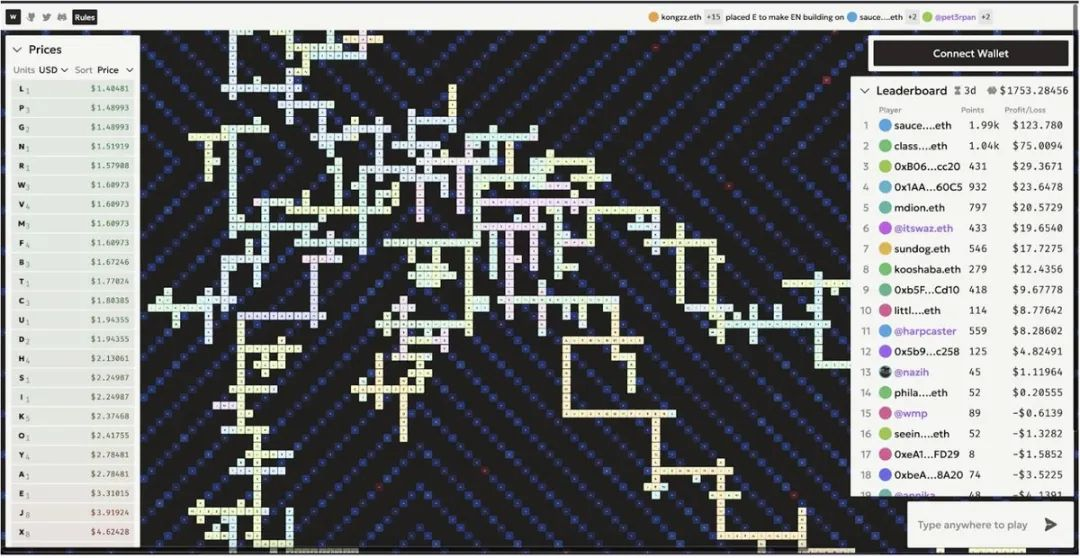 最后一个方向还是回到 fully on chain gaming,这个方向我之前提到过,想跟大家分享我看到的一个青年游戏天才开发者 Small brain——设计精巧的全链游戏的Word3、Drawtech、Gaul。其背后的设计师,不但自己开发了许多出彩的玩法,创造出具有区块链特色的游戏,也凭借在 AW 社区中独到的观点输出,号召起一帮志同道合的开发者,在 mud 上迅速 iterate。他们朝着每隔六周推出一款新全链游戏的目标前进, 做出了许多有趣的实验。