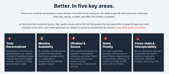 Supra Oracles 是一个利用预言机和智能合约的力量为区块链生态系统带来前所未有的信任、安全性和可扩展性水平的平台,SupraOracles目前,他们拥有超过600家合作伙伴,其中包括@coinbase、 @animocabrands、 @HuobiGlobal等众多,这也包括万事达卡等 Web2 合作伙伴。Arbitrum、Sui、GameSwift_io 和 DeFi Kingdoms 是 Supra 目前正在涉足的一些生态系统。他们的团队非常精英,他们的工程师曾任职于微软、甲骨文、Consensys、NASA、Visa 等公司。