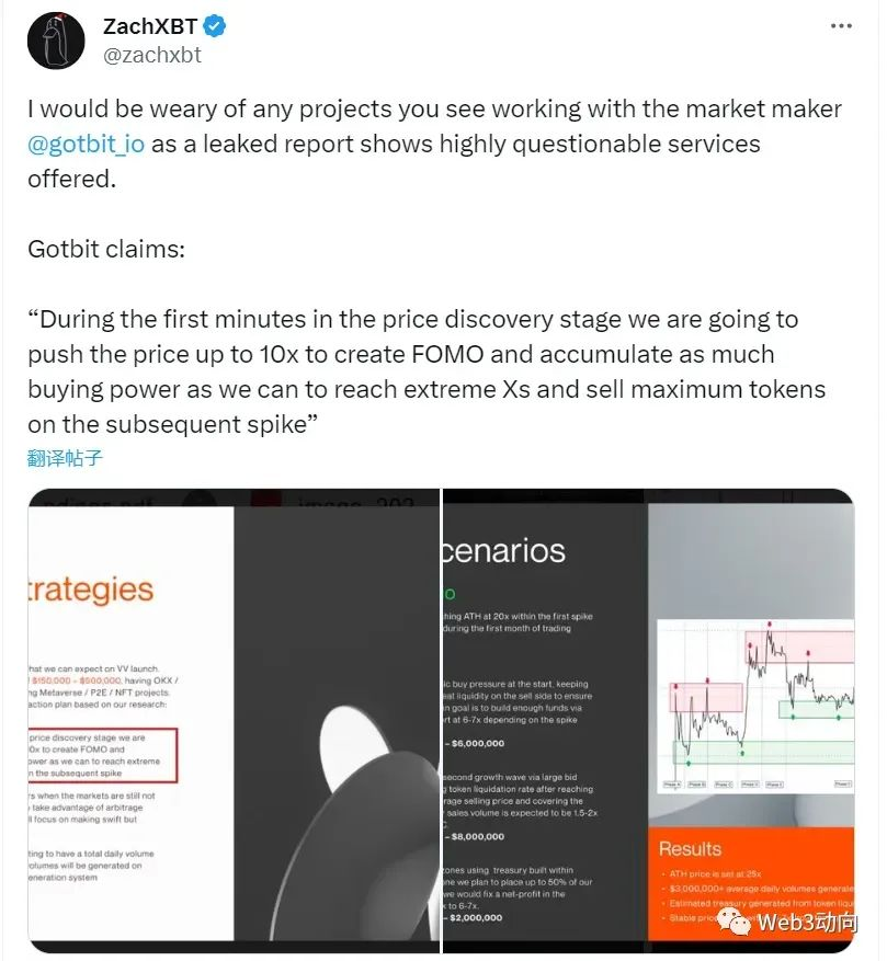 ZachXBT 所提供的材料,可以从一定角度印证上文所讲的主动型做市风格,Gotbit 为项目方所提供的做市策略偏向于以利润为前提,通过拉升币价,高点出货。