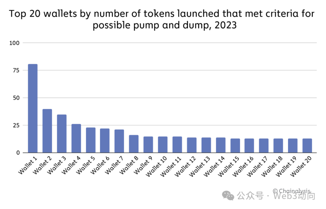 一些参与者似乎还发行了多个符合标准的代币。这可能是使用相同模式产生更多利润的一种方式。下图为2023年按发行的代币数量排名前20的钱包。