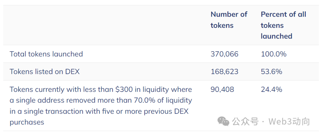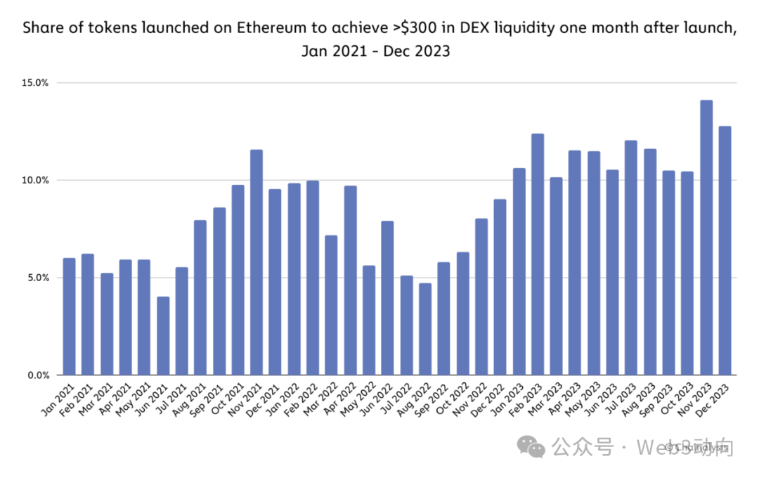 但并非所有代币都能获得大量的市场关注。在任何一个月里,只有不到14.1%的代币在接下来的一个月内达到了300美元以上的DEX流动性,而在2023年发行的代币中,只有5.7%的代币超过了这一门槛。虽然这一数据比前两年有所增加,但较低的流动性表明,在不对价格造成重大影响的情况下,大多数发行的代币不能轻易与ETH、wETH、USDC、USDT和wBTC等资产进行兑换。