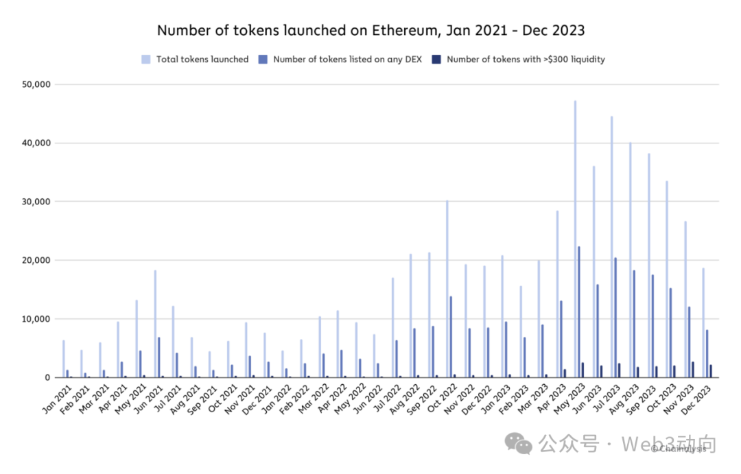 在2023年,以太坊链上发行了超37万种代币,其中约16.86万种可在至少一个DEX进行交易。如下图所示,自2022年年中以来,每月发行的代币数量一直在增加,最近的峰值接近每月5万个。