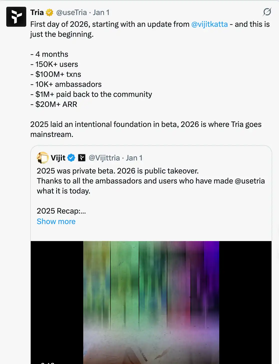 Tria 的 2000 万美元年化收入(ARR)提供了一个模板:通过真实交易获得真实收入,而不是依赖代币激励。