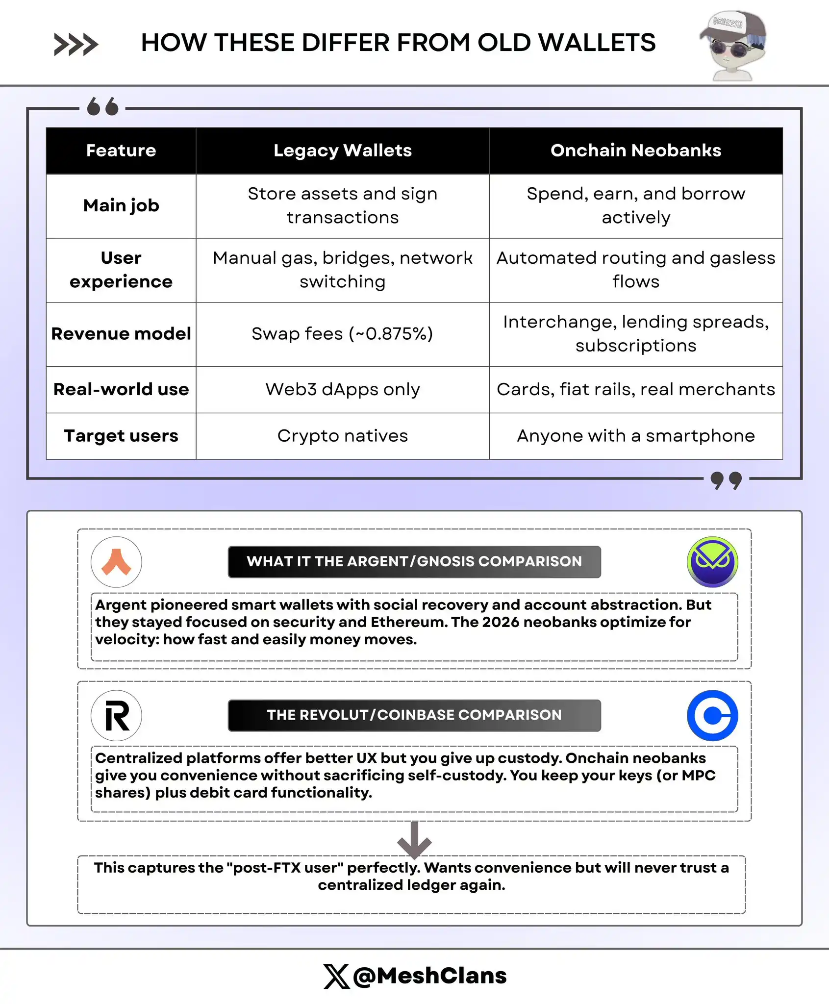 Argent 率先推出了智能钱包,结合了社交恢复(social recovery)和账户抽象(account abstraction)技术。然而,Argent 一直专注于安全性和以太坊生态。而 2026 年的新型链上银行则将重点放在资金流动的速度和便捷性上——即如何让资金更快、更轻松地流动。