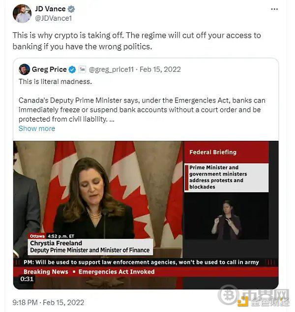 当加拿大在 2022 年冻结那些抗议 Covid-19 限制的人的银行账户时,万斯在推特上写道:“这就是加密货币正在崛起的原因。如果你的政治立场不对,政权会切断你对银行服务的访问。”