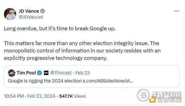 在出席 RemedyFest 的几天前,万斯还在 X 上的一篇帖子表示“是时候拆分谷歌了”,该帖子声称谷歌新闻近年来越来越多地引用左倾消息来源,认为“谷歌和 Facebook 确实干扰了我们的政治进程。”