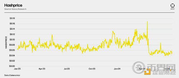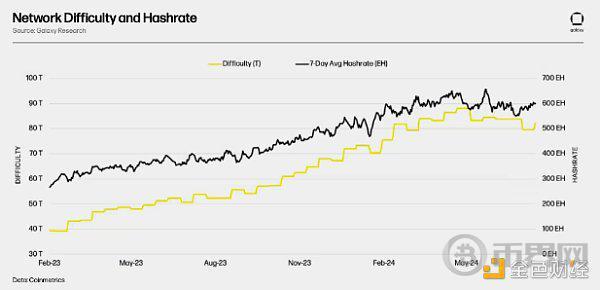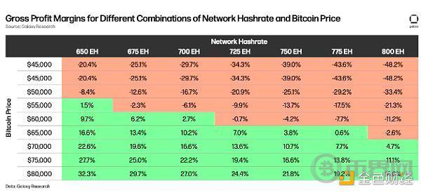 在当前的哈希价格水平下,网络中相当一部分矿工仍然盈利,但盈利幅度很小。一些持观望态度的矿工可能会继续运营,因为他们可以产生正的毛利润。然而,当考虑到运营费用和额外的现金成本时,许多矿工发现自己无利可图,现金也慢慢用完了。2024 年第一季度强劲的经济状况帮助建立了现金余额,这延长了低效矿工的生存期。如果比特币价格或交易费没有显著上涨,我们预计,如果哈希价格进一步下跌,某些矿工将退出网络。