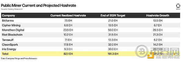 首先,我们将研究 2024 年下半年上市矿企的算力增长情况。在 2024 年上半年,在估值飙升和股票市场筹集巨额资金的帮助下,上市矿企对新一代机器进行了大规模采购订单。下表总结了 6 月份实现的算力数字、2024 年底的目标以及部分上市矿企 2024 年下半年隐含的算力增长。总的来说,假设每个矿工都达到了既定目标,这些上市矿企预计将激发 109 EH 的增量算力,这意味着仅 7 名矿工就能带来约 18% 的网络算力增长。