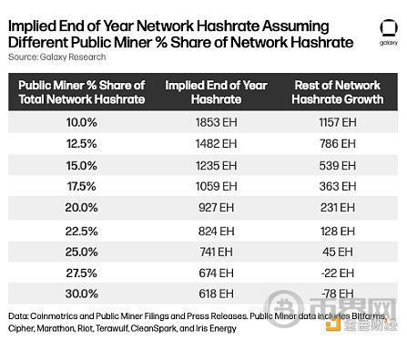 一种过于简化的方法是将 109 EH 除以 13%,得出网络其余部分非凡的 838 EH 增长。然而,这是假设上市矿企将继续保持 11-13% 的网络比例。下面的情景表显示了如果我们改变上市矿企在年底算力中的份额,并假设当前网络算力为 587 EH,上市矿企算力增长 109 EH,当前上市矿企在网络算力中的份额为 13%,那么年底算力会是多少。