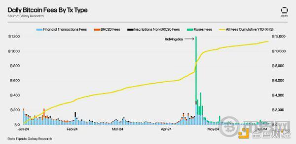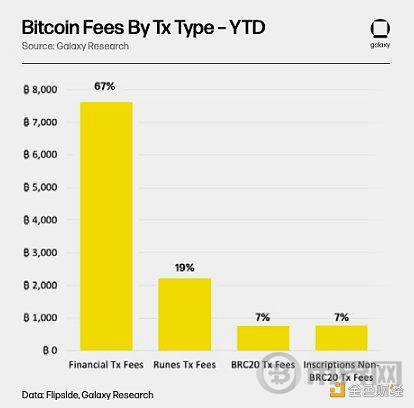自 2024 年 1 月 1 日以来,矿工费用收入的 67% 来自标准金融交易,而 19% 来自 Runes。BRC-20 和 Ordinals 交易合计占年初至今比特币费用的 14%。
