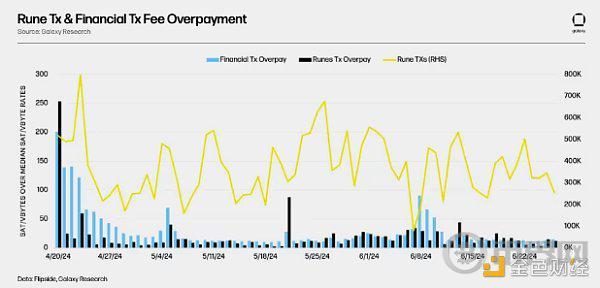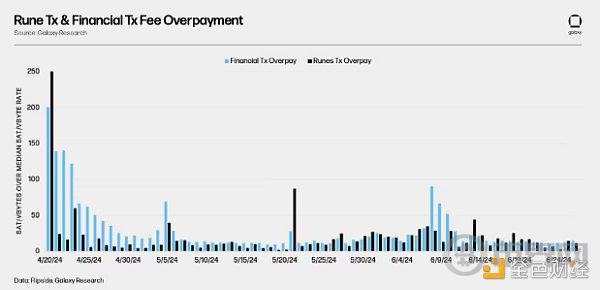 将 Rune 交易的每日数量与上图叠加后,我们发现 Rune 交易的激增与金融交易多付款的激增呈正相关。时间敏感的金融交易被迫与 Rune 交易竞争区块纳入。虽然有些日子 Rune 交易激增时 Rune 交易会为区块纳入多付款,但这些被视为与特定 Rune 代币铸币厂相关的异常值。