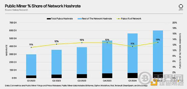 接下来,为了估计网络其余部分的增长情况,我们分析了这部分上市矿企的算力相对于网络其余部分的趋势。如下所示,从历史上看,这部分上市矿企占网络的 11%-13%。