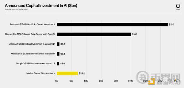 截至 7 月 22 日,上图中公司(纯业务 + 混合业务)的总市值为 282 亿美元。当你将这个数字与涌入 AI 的资本进行比较时(如下图所示),很难想象未来处于有利地位的矿工不会转向混合方法。随着计算需求的增长,包括亚马逊、微软(星际之门、威斯康星、瑞典)、谷歌等超大规模企业已宣布未来几年在 AI 领域大规模增长的计划。