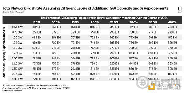 因此,严格从上市矿企的角度来看,这将我们的算力增长基准定为 741 EH。我们预计,今年下半年将有相当数量的额外算力投入使用,我们认为通过更换机器和净新增产能投入使用,这是可行的。回顾我们在上一份年度报告中进行的分析,下面的敏感度表显示了在更换网络百分比和额外 GW 产能扩张的不同组合下,网络算力将达到多少。我们从 587 EH 的网络算力开始,假设插入的新机器的效率为 17.5 J/TH,被替换的机器的效率为 30 J/TH。