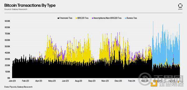 自 2024 年 1 月 1 日以来,比特币促成了超过 9900 万笔链上交易。在这 9900 万笔交易中,50% 是标准交易,我们将其定义为金融交易。Runes、BRC-20 和 Ordinal 交易分别占交易量的 35%、11% 和 4%。考虑到 2024 年 4 月 19 日推出的同质化代币协议,Rune 相关交易占总交易量的 35% 的市场份额意义重大。自推出以来,Runes 平均占比特币所有交易的 63%。