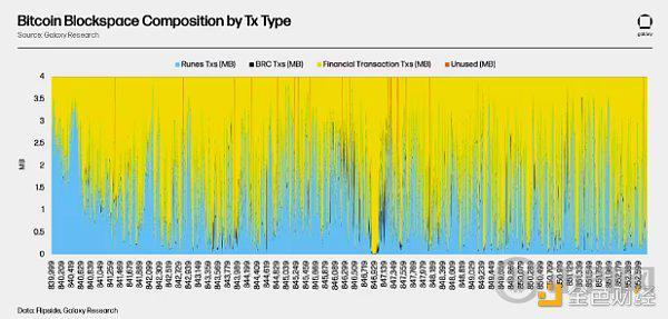 逐个区块分析数据可以发现,在 10 分钟的间隔内,标准金融交易与 Runes 交易的频率不同。自减半区块(第 840,000 个区块)以来,金融交易平均每个区块 2.4 MB,而 Runes 交易一直占用约 1.5 MB 的区块空间。尽管 Runes 是一种比 BRC-20(平均每区块 0.06 MB)更高效的同质化代币标准,但 Runes 在区块空间上相对于 BRC-20 的主导地位凸显了市场对 Rune 代币标准的偏好。在减半区块中,Runes 交易消耗了 2.7 MB,约占第 840,000 个区块总空间的 68%。