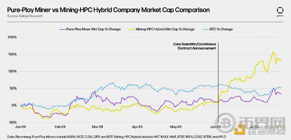矿工于 2023 年开始涉足 AI/HPC,但 2024 年 6 月 CoreWeave 和 Core Scientific 达成的 200 MW托管交易令业界措手不及。在 AI 热潮之前,大型矿工拥有的这些“巨型站点”的价值纯粹在于其比特币挖矿潜力。然而,CoreWeave 交易对 Core Scientific 股价的影响证明矿工可以从 AI 优势中获益。下图显示,与那些仍然专注于纯挖矿策略的矿工相比,那些已采取措施采用混合挖矿/AI 方法的矿工受益匪浅。