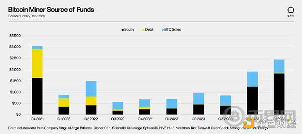 2024 年上半年,矿工筹集了前所未有的资金。自 2023 年第四季度,由于对现货比特币 ETF 获批的预期,估值开始飙升,矿工继续筹集资金(主要是股本),以迅速扩大规模,直至减半。2024 年第一季度,上市矿企共筹集了 18 亿美元,创下了过去 3 年来单季度筹集的最高金额。