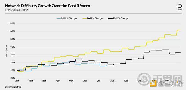 2024 年的网络难度与 2022 年和 2023 年的增长轨迹相似。2024 年的难度与 2022 年的难度趋势同步变化。2022 年,从 10 月到年底,难度从 9 月到年底增加了 14%。2023 年,从 9 月到年底,难度增加了 29%。如果我们将这些增长率应用于 587 EH 当前网络算力,则意味着范围为670 EH 到 760 EH。虽然我们之前从上市矿企那里得出的目标处于这个范围的高端,但它让我们对从基础设施建设的角度来看什么是可行的充满信心。