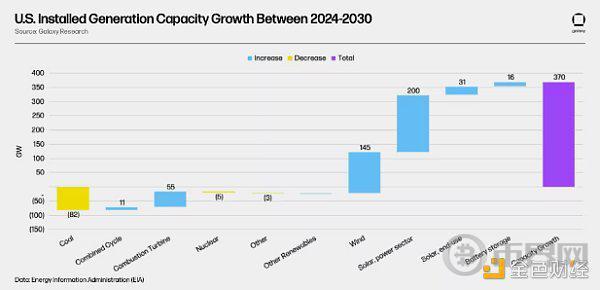 到 2030 年,全球数据中心需求预计将增长160%。目前,美国数据中心需求估计为21 GW,预计到 2030 年将增至 35 GW。美国装机发电量预计在同一时期将增加约 370 GW。然而,如上图所示,美国能源信息署(“EIA”)预计可调度发电源(煤炭、天然气、核能等)将出现净减少,这意味着不可调度的间歇性发电源(风能、太阳能等)将在很大程度上填补预期的供需缺口。因此,如果将其转换为太瓦时(“TWh”),预计发电量将增加 240 TWh,而新数据中心负载(假设正常运行时间为 99.995%)将增加 123 TWh(14 GW / 1000 * 8,760 小时/年 * 99.995%)。间歇性发电源的增加,加上不灵活的数据中心负载带来的需求不断增长,可能会导致电网拥堵、输电限制和供应短缺,因为预计其他行业(如电动汽车和国内工业制造)的负载将增长。在电网运营商评估美国快速增长的电力需求相对于发电增长的情况下,这可能会导致负载互连研究、批准的爬坡计划和设施协议进一步推迟。马克·扎克伯格在最近接受 Dwarkesh Podcast 采访时指出,目前还不存在千兆瓦数据中心,“现在的关键是确保能源”,这是 AI 超级计算机驱动竞赛中最大的瓶颈。电力容量的竞赛正在进行中,拥有大规模电力、连续土地、水和光纤连接的比特币矿工最有能力利用这一大趋势。