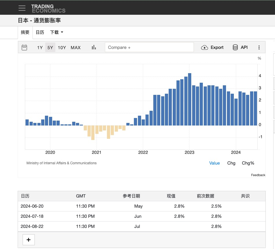 但是另一方面,另一个套息交易路径的存在,大量的日元被兑换成了美元,用于购买美元资产,这就造成了日元对美元进入了长期的贬值趋势,从2021年到2024年,美元对日元价格从最低103,一路上涨到160,日元贬值幅度超过60%,但是考虑到货币汇率的波动对于本国国民的获得感其实并没有如此强的影响,所以即是在这样的贬值之下,日本国内通胀也在有条不紊的增长。