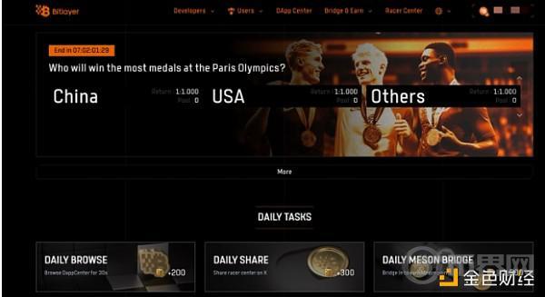 8月2日,比特币原生二层项目Bitlayer上线了一个2024年奥运会的限时竞猜活动,就是一个把积分玩起来的方法。用户可以用Bitlayer的积分和宝石参与奥运会相关话题竞猜,有机会赢取高达5倍的积分或宝石奖励。这种结合奥运会热点和预测市场的积分玩法,有机会让用户短时间将手中的积分和宝石奖励倍增,值得大家参与。