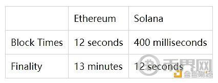 Solana 提供低交易延迟,交易在几秒钟内就能被处理和确认。该网络实现了大约400毫秒的出块时间,确保了快速的交易最终性。为了更好地理解这一点,我们可以对比一下:相比 Solana 的每个区块出块需要400毫秒,Ethereum 的出块时间是12秒。Solana 每个区块在大约5到12秒内达到最终性,Ethereum 最终性通常需要约13分钟才能达到。