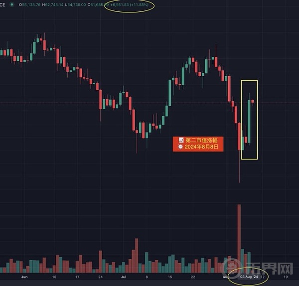 在这样重大利好的加持下,比特币也没有让市场失望,昨天一天从55000美金攀升至61000美金,创下有史以来单日第二市值涨幅!!而第一市值涨幅发生在2021年2月8日上个牛市,日内上涨 19.54%!