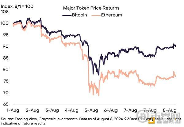 • 由于对美国经济前景和更广泛的金融市场波动的担忧,加密货币估值在 8 月初下跌。以太坊表现不佳,可能是由于期货市场定位增加以及少数大持有者的抛售。