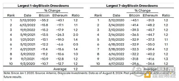 图 3:平均而言,以太坊的跌幅通常是比特币的 1.2 倍