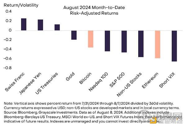 导致下跌的直接原因是 8 月 2 日星期五发布的美国 7 月份就业报告弱于预期。特别是,该报告显示失业率上升幅度与以往的经济衰退时期一样。[1] 对周期性衰退的担忧导致股票等周期性资产表现疲软,而美国国债、日元和瑞士法郎等传统避险资产表现强劲(图 2)。非美国股票和做空美国股票波动性的策略表现尤其糟糕。比特币和以太坊均下跌;虽然比特币在风险调整后表现相对较好,但以太坊的表现不及其他加密资产和许多传统市场部分,我们将在下文进一步探讨。在主要加密资产中,Solana 的表现明显优于其他加密资产。