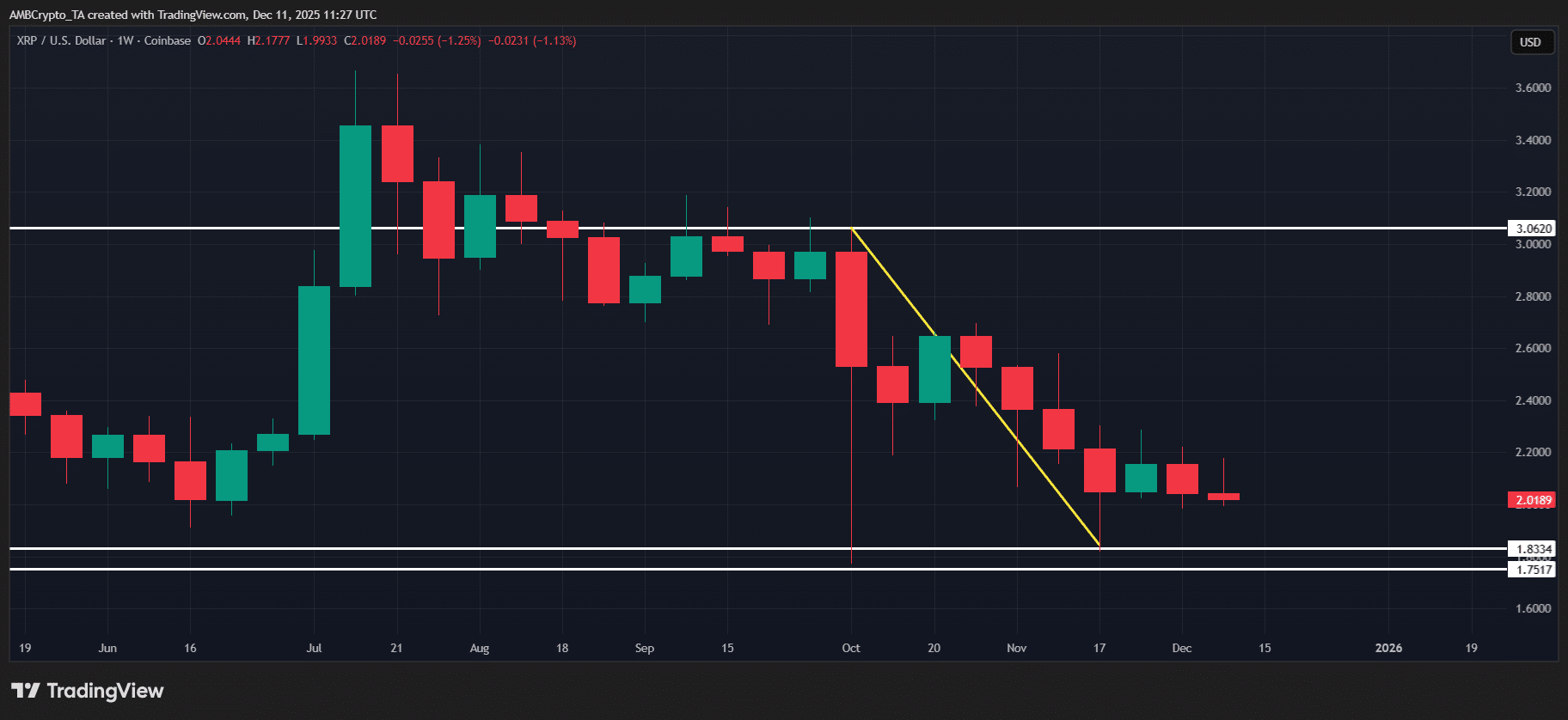 XRP 已经两次跌破 2 美元的底部,并呈现出看跌的图表结构,但历史上的横盘整理往往是积累的前兆。