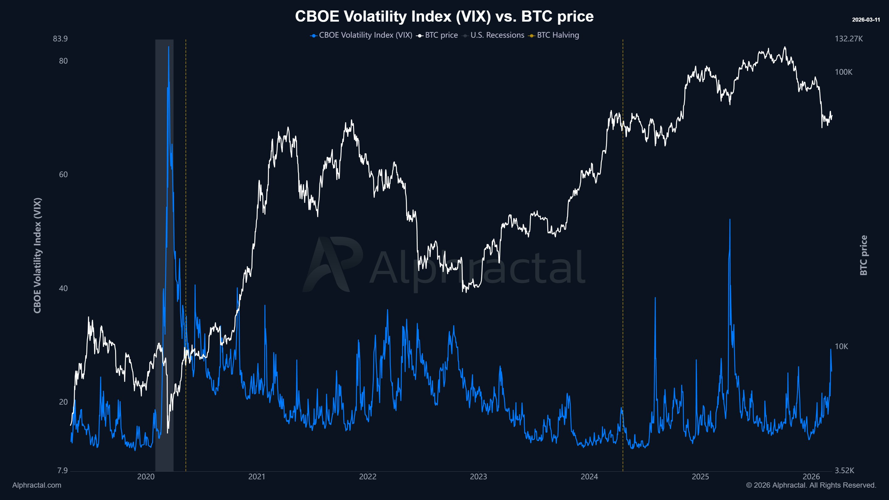 关键观察指标为芝加哥期权交易所波动率指数(VIX),该指标反映市场对美股的预期波动与恐慌情绪。Alphractal 数据显示,当前 VIX 约为 30,表明市场处于中等波动区间。