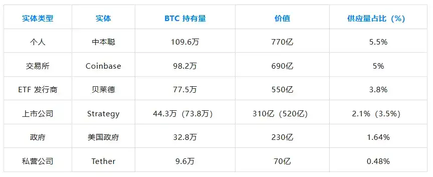 以下是来自各个主要实体类别(个人、交易所、ETF 发行商、政府机构、上市公司和私营公司)的顶级比特币持有者。