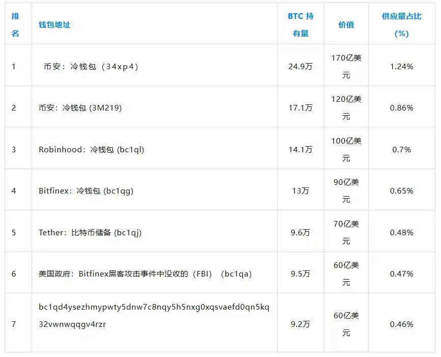 然而,也可以查看单个钱包,而无需将其归类到相应的实体中。下表列出了最大的单个钱包。前四名均为由全球最大交易所控制的冷钱包。
