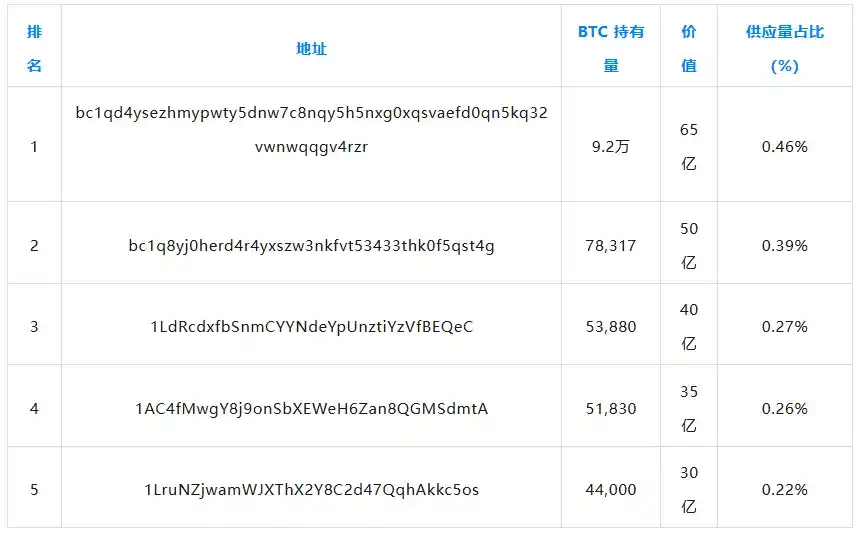 就单个地址而言,持有比特币数量最多的钱包是币安交易所的冷钱包,持有近 25 万枚比特币。你还可以查看持有比特币最多的实体。 实体是指经确认由同一个人或机构(例如交易所、DeFi 协议或公司)控制的加密地址集合。