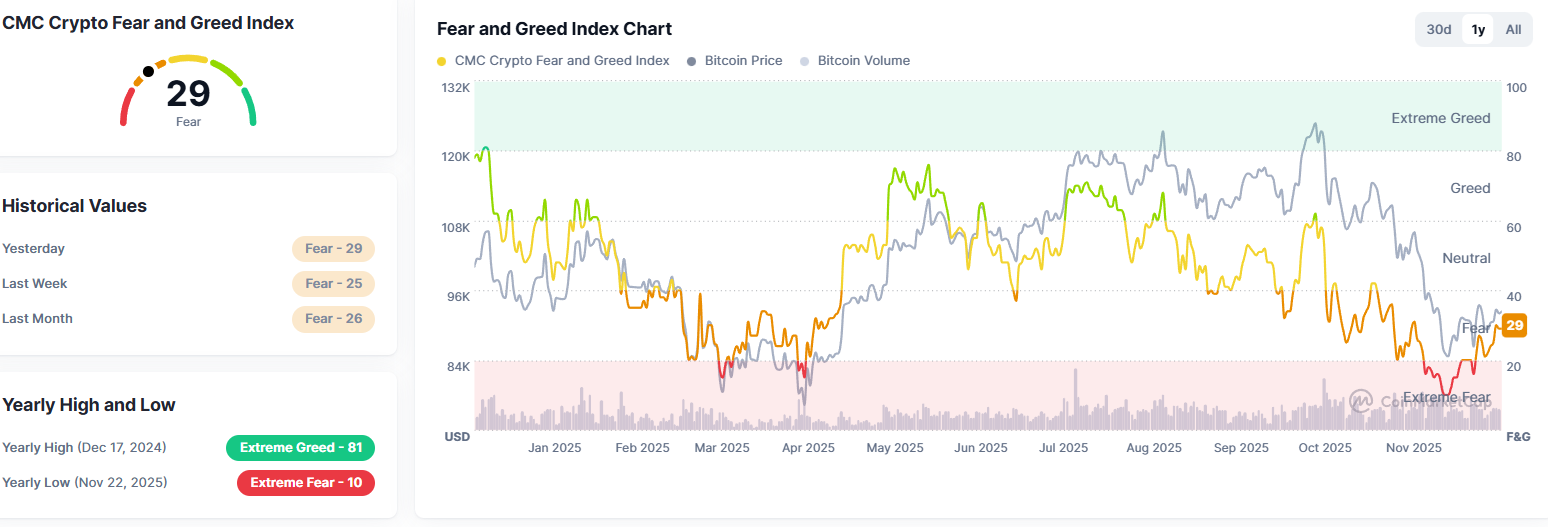 根据CoinMarketCap的恐惧与贪婪指数,加密货币投资者情绪从11月23日记录的10“极度恐惧”小幅回升,但目前的29读数仍显示为“恐惧”,远低于10月7日190亿美元加密货币市场暴跌发生前的62“贪婪”水平。
