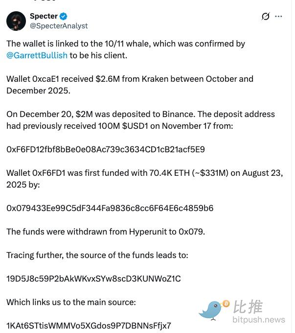 地址0x98b的所有者引发了社区猜测。通过链上追踪,分析师Specter认为该钱包很可能与1011 内幕巨鲸Garrett Jin有关。
