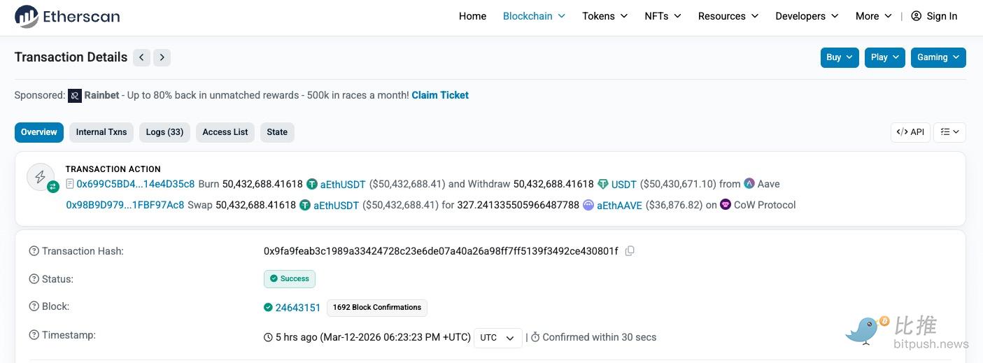 故事的主角,是一位匿名“大户”。他通过DeFi借贷协议Aave的APP界面,发起了一笔看似简单的交易:将高达5043万美元的USDT稳定币,兑换成AAVE代币。