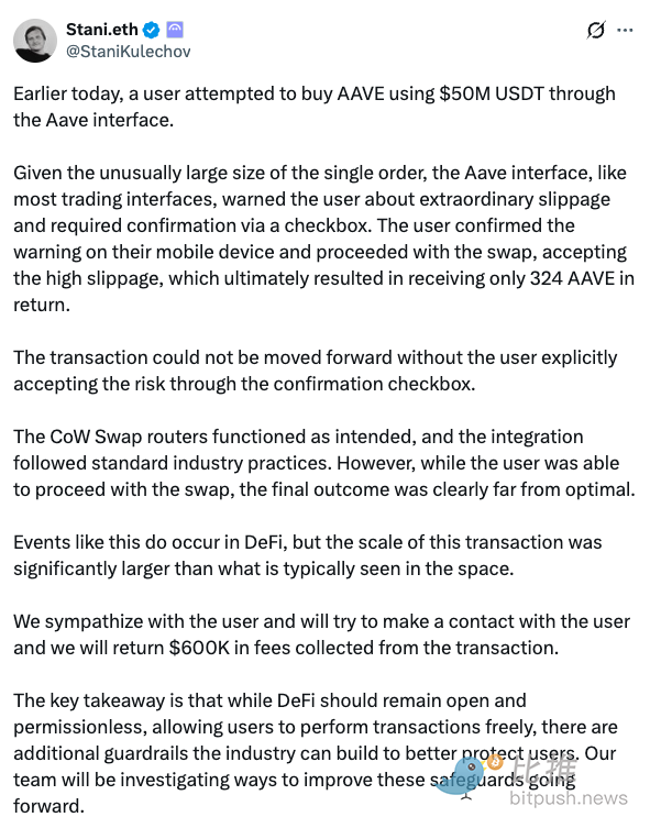 Aave团队的反应也颇为迅速。创始人Stani承诺,将退还该笔交易中收取的约60万美元手续费给受害者。更重要的是,他们宣布将重新审视和改进相关的防护措施,比如优化UI/UX设计,设置更严格的滑点上限等,以防止类似悲剧重演。