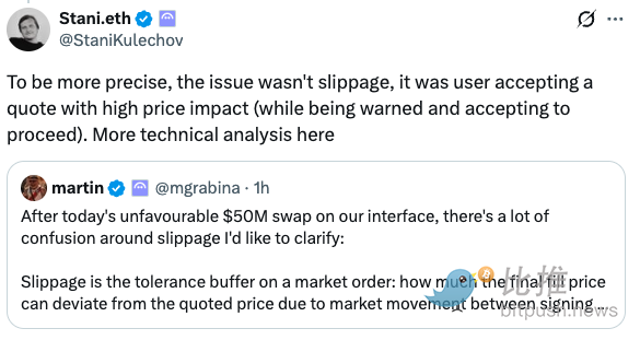 更多的人则将矛头指向了Aave的界面设计。他们认为,一个仅仅用复选框来阻挡5000万美元损失的UI,本身就是失败的。有开发者建议,对于这种极端的、明显不合理的交易,界面应该设置更“激进”的摩擦,比如强制要求用户输入“我确认我将损失99.9%的资金”这样的特定短语才能继续,或者直接设定无法超越的滑点上限。