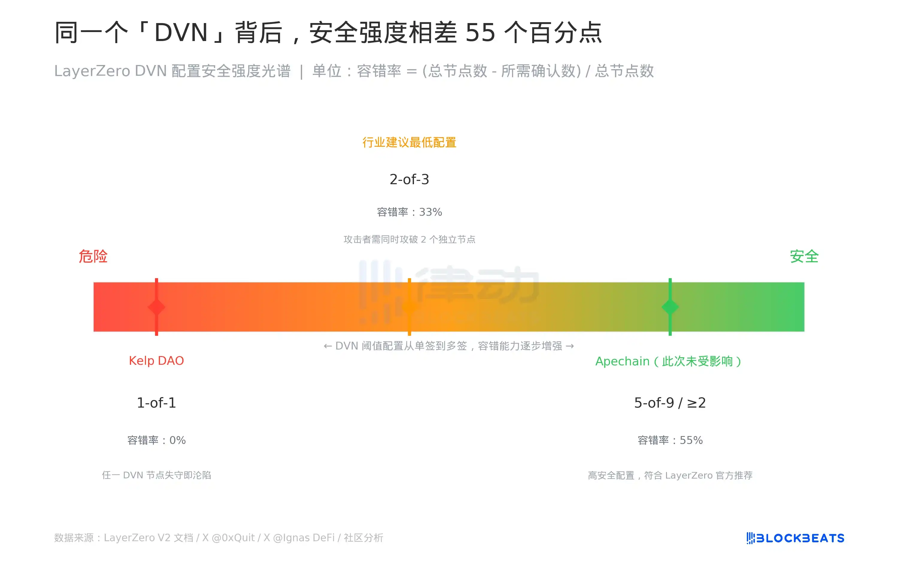 Kelp DAO chose the far left end of the spectrum: 1-of-1, requiring confirmation from only one DVN node. This meant a fault tolerance of zero; the attacker only needed to compromise that one node to forge any cross-chain message. In contrast, Apechain, also integrated with LayerZero, configured more than two required DVNs and was unaffected in this incident. LayerZero's official statement used the wording "all other applications remain secure," the subtext of which is: security depends on which configuration you chose.