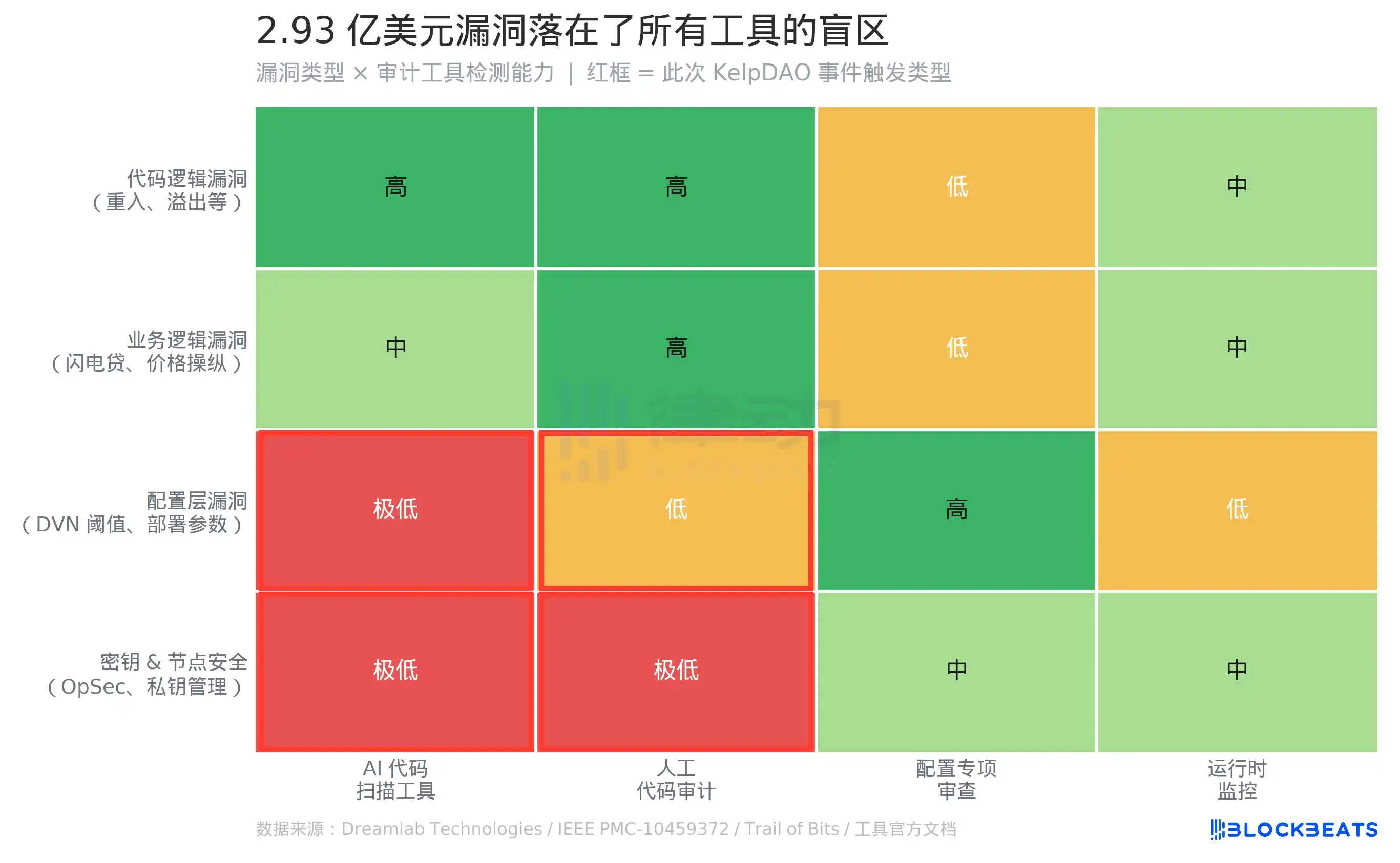 Also in the red zone are key and node security. @0xQuit's description mentioned the DVN node being "compromised," which falls under operational security (OpSec), beyond the detection boundaries of any static analysis tool. Neither any first-tier auditing firm nor AI scanning tools have the ability to predict whether a node operator's private key will be leaked.