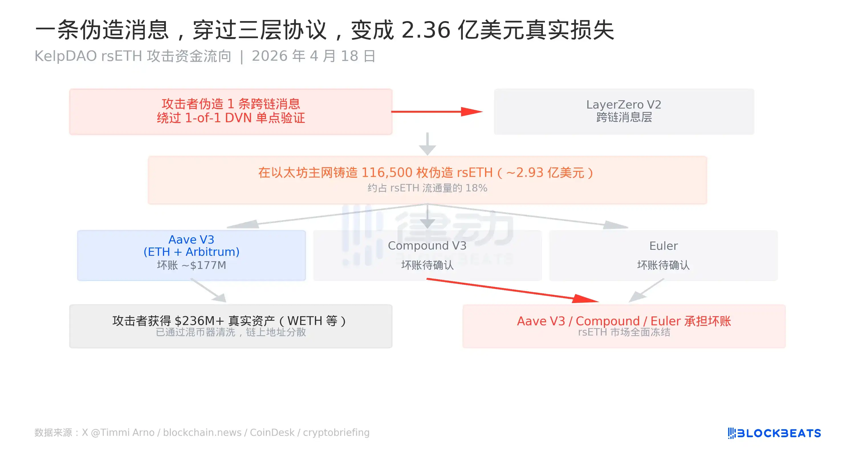 On April 18, 2026, attackers drained 116,500 rsETH, worth approximately $293 million at the time, from the cross-chain bridge of Kelp DAO's liquid restaking protocol within hours. The entire process was unusually efficient—from forging cross-chain messages to dispersing the stolen funds across three lending protocols, Aave V3, Compound V3, and Euler, to borrow real assets. The attackers exited the same day with $236 million in WETH. Aave, SparkLend, and Fluid promptly froze all rsETH markets.